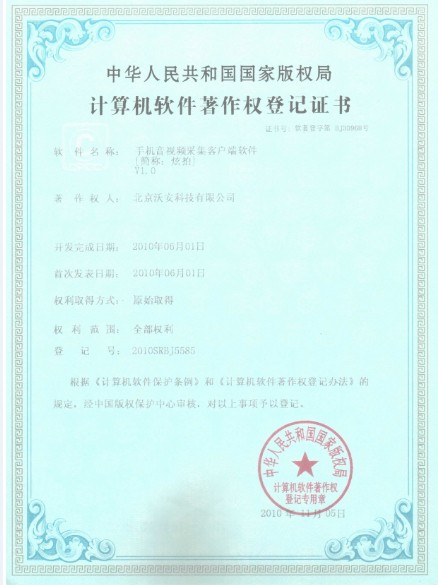 根據(jù)《計算機軟件保護條例》和《計算機軟件著作權(quán)登記辦法》的規(guī)定,經(jīng)中國版權(quán)保護中心審核,沃安科技“手機音視頻采集客戶端軟件(炫拍)”獲得計算機軟件著作權(quán)登記證書。