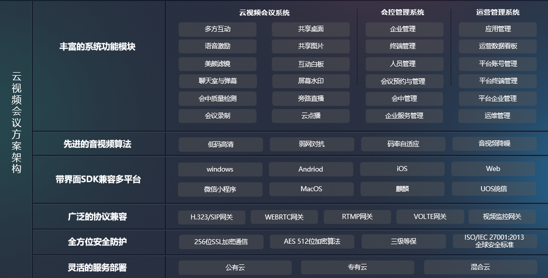 企業(yè)云視頻會議解決方案需要具備跨組織架構(gòu)層級、跨省市地域,兼容各類軟硬終端,打通各類業(yè)務(wù)互聯(lián)的音視頻云服務(wù)和業(yè)務(wù)支撐能力。